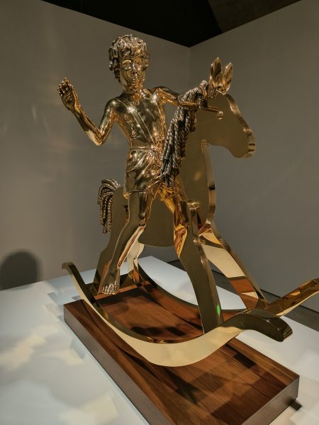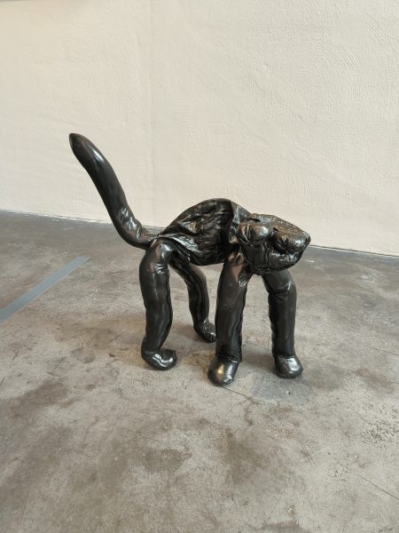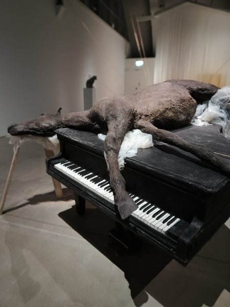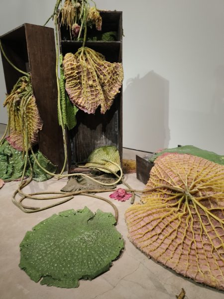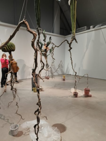 Avajaiset muistaa Perssonin loukkaantunutta, kokoon kursittua hevosta kuvaavan veistoksen Amos Rexin näyttelystä noin vuosi sitten. HAMissakin esillä on yksi hevostyö eli Luihin ja ytimiin (2025). Mitä se ilmentää? Oliko työjuhta kuollut korkeakulttuurisen flyygelin päälle? Vai oliko kyseessä jokin mafiaviittaus? Ainakin teos on absurdi. Samoin ovat Perssonin roikkuvat, henkitoreissaan kituvat kaktuksensa teoksessa Nousuvettä odottaessa (2025). Kaktukset ovat sitkeyden ja selviytymisen symboleja ja nyt ne roikkuivat erilaisten tukirankojen ja apuvälineiden varassa, juuret esillä, haavoittuvana ja haavoittuneena. Perssonin materiaali silikoni taipuu upeasti myös jätillisiksi, limaisiksi alien-lootuksenlehtikasveiksi Meduusan keho (2025) -teoksessa.