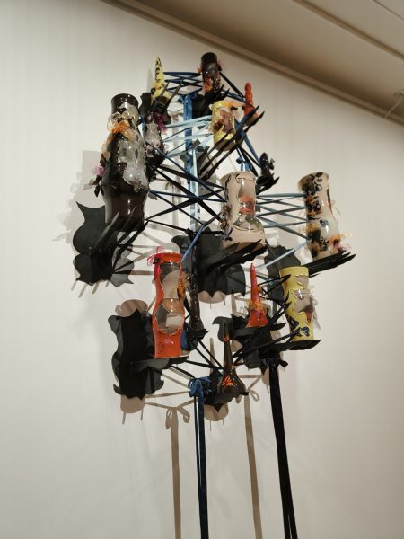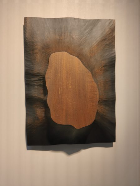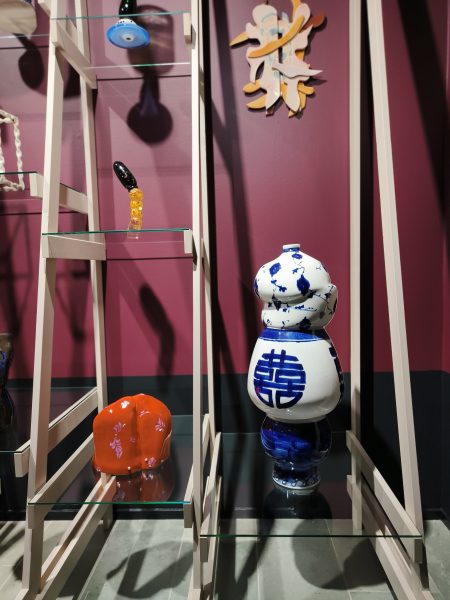 Kun astuimme näyttelytilaan, mieleen tuli ajatus, mihin näyttelyyn oikeastaan olemme tulleet. Designin ja taiteen välistä rajaa oli vaikea vetää. Oliko kyse käyttöesineistä vai taiteesta? Esillä oli maljakoita, peilejä, hyllyjä ja kaappeja, mutta myös selkeästi taide-esineitä. Museon tiedotteessa kerrotaankin, että ”Hartikaisen veistokselliset puu- ja lasiteokset haastavat rajoja muotoilun ja taiteen välillä”.