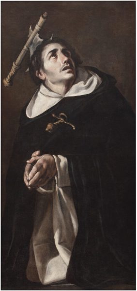 Teos esittää dominikaanimunkki Pietari Marttyyriä, joka toimi 1200-luvun alussa inkvisiittorina Pohjois-Italiassa. Eräällä matkalla hänen kimppuunsa hyökättiin ja häntä lyötiin ensin kirveellä päähän ja sitten tikarilla rintaan. Katolinen kirkko totesi Pietarin kuolleen marttyyrinä ja hänet julistettiin pyhimykseksi.