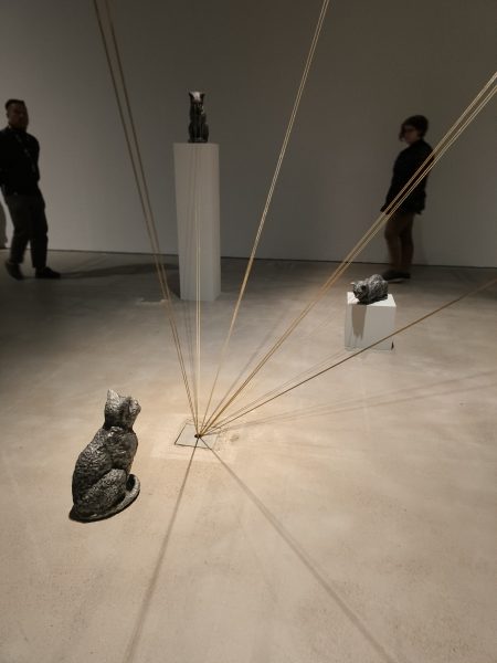 Vihriälän teokset ovat helposti lähestyttäviä ja ymmärrettäviä, mutta kissatyö Aisti (2025), jossa yhdeksän kissaa katselee tiukasti yhtä kohtaa lattiassa, mietitytti. Mitä siinä kuvattiin? Polttopistettä? Pakopistettä? Leikkauspistettä? Kissojen sieluja? Kissan 9 elämää…